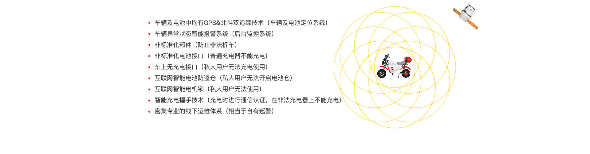 人民出行项目的车辆采用以下防盗技术,首先让偷盗没有价值,其次可以第一时间发现并制止,最终达到震慑盗贼,显著降低偷盗率,维护社会治安的稳定。